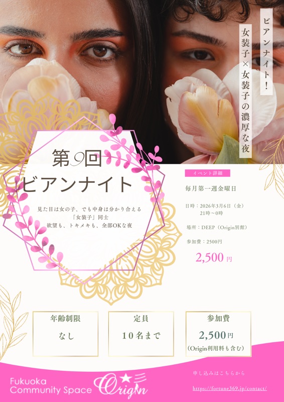 3月6日(金)21時よりビアンナイト開催 2026年3月5日 最終更新日時 : 2026年3月5日 originjosou358 3月6日(金)21時よりビアンナイト開催します 参加希望の方は申し込み宜しくお願いします 申し込みはこちら→ fortune369.jp/contact/ Follow me! @https://twitter.com/DEEP_deep0000 twitter